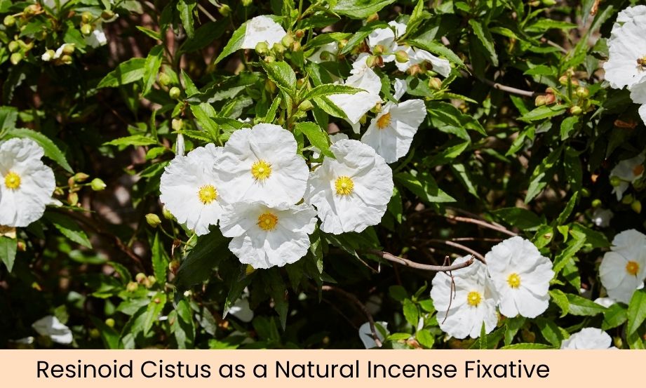 Explain clearly and technically how Resinoid Cistus functions as a natural fixative in incense. Describe how it stabilizes volatile aromatics, smooths combustion in sticks and cones, preserves scent character over time and improves perceived longevity - while showing when to use Cistus Essential Oil within a practical formulation context.